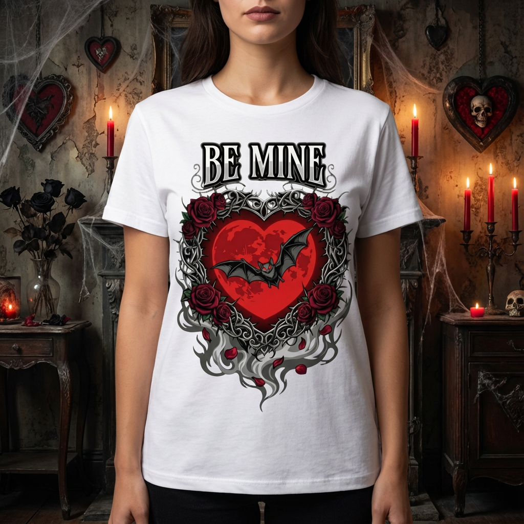Gothic Valentine Vampire White Shirt | “Be Mine” Bat & Rose Heart Tee | Dark Romance Goth