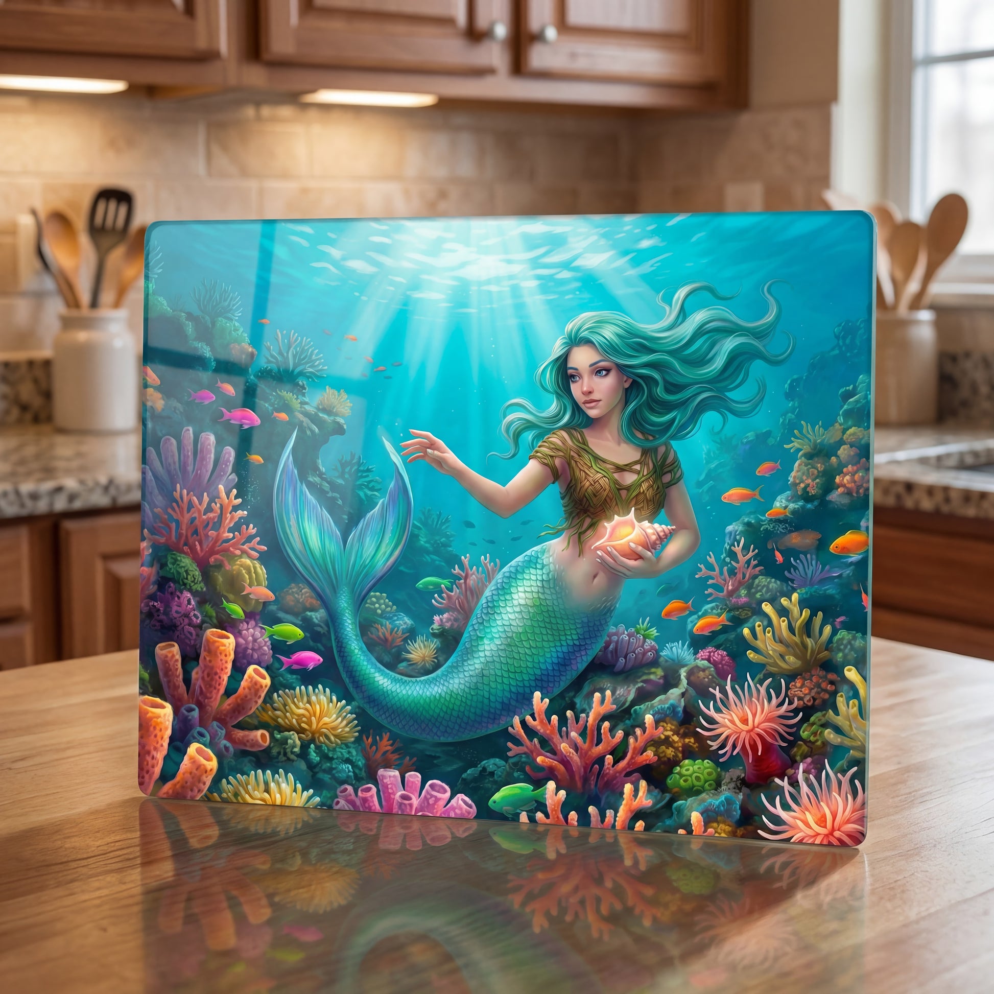Featuring a serene sea goddess drifting through a colorful coral reef under sunbeams, this piece doubles as functional kitchenware + decorative counter art—perfect for coastal homes, mermaid lovers, and anyone obsessed with ocean vibes.