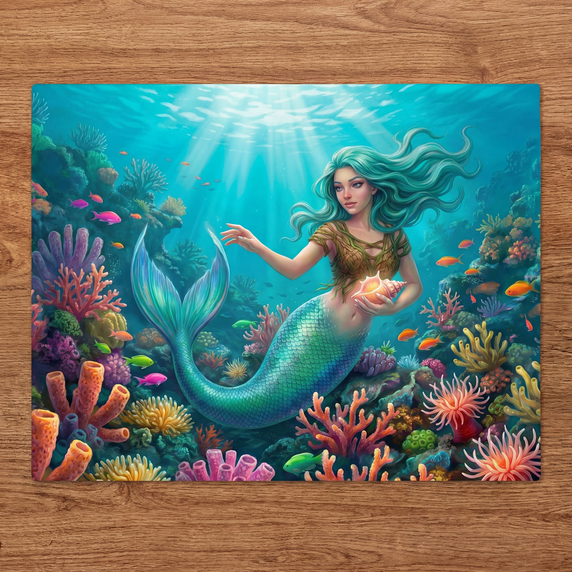 This mermaid-in-the-reef design turns everyday meals into a little ocean escape—sunbeams streaming through turquoise water, colorful coral gardens, and tropical fish drifting by. Mermaid-themed table pieces are a fun way to tie a kitchen/dining space together, and this set makes it easy to add that pop of ocean color year-round. ✨